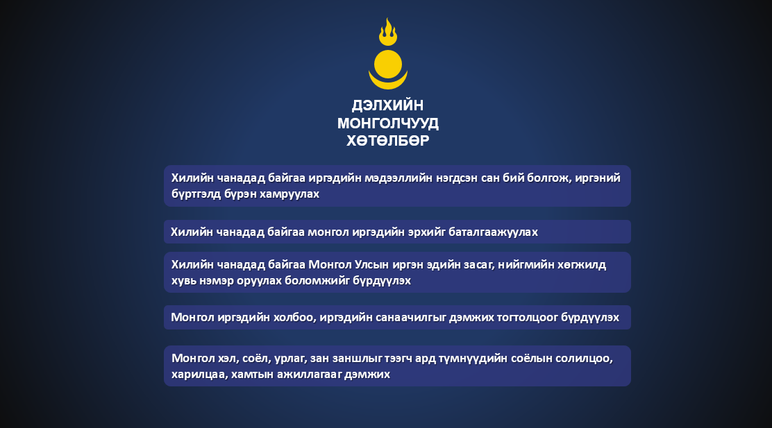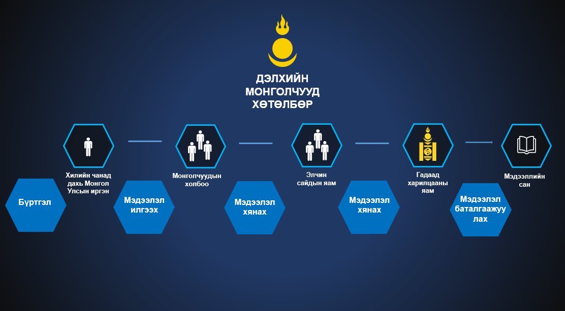 ҮНДЭСНИЙ ХӨГЖЛИЙН ГАЗАР БОЛОН БАЯЛАГ БҮТЭЭГЧДИЙГ ДЭМЖИХ ХОЛБОО ГЕРМАН УЛСАД СУРЧ, АЖИЛЛАЖ БУЙ МОНГОЛ ИРГЭДТЭЙГЭЭ УУЛЗАЖ ШИНЭ ЦАХИМ ПЛАТФОРМ БОЛОН bayalagbuteegch.mn САЙТАА ТАНИЛЦУУЛЛАА. "ДЭЛХИЙН МОНГОЛЧУУД" ХӨТӨЛБӨРӨӨ ТАНИЛЦУУЛЖ ТЭДНИЙ САНАЛ ХҮСЭЛТИЙГ АВЛАА. БАЯЛАГ БҮТЭЭГЧДЭЭ ДЭМЖИЖ, НЭГТГЭХ АЖИЛ ГЕРМАН УЛСААС ЭХЭЛЛЭЭ. ДЭЛХИЙГЭЭР ТАРХСАН 130.000 МОНГОЛЧУУД БАЙДАГ ЮМ БАЙНА. ДЭЛХИЙН МОНГОЛЧУУД ХӨТӨЛБӨР, ТҮҮНИЙГ ХЭРЭГЖҮҮЛЭХ ЦАХИМ ПЛАТФОРМЫН ТАЛААР ЗӨВЛӨЛДӨХ УУЛЗАЛТ ГЕРМАН УЛСЫН ЭЛЧИН САЙДЫН ЯАМАН ДЭЭР БОЛЛОО.