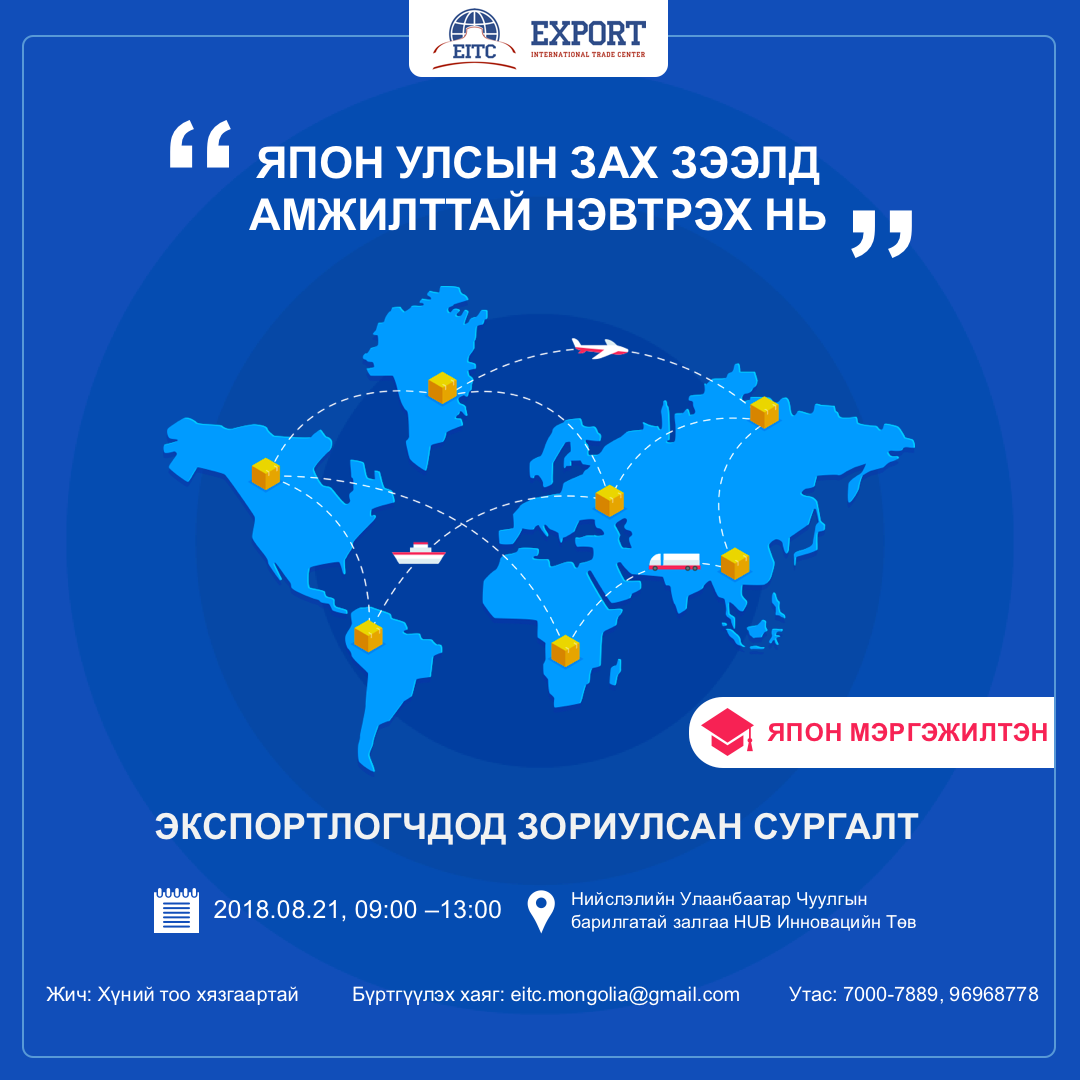Монгол улсын экспортын чиглэлд үйл ажиллагаа эрхэлж буй ААН-ийн менежментийг сайжруулах зорилготойгоор компаний удирдах дээд шатны албан тушаалтнууд болон менежерүүдэд зориулан онол, практик болон Олон улсын (Япон улсын) стандартад тулгуурласан экспортын үр дүнтэй сургалтыг зохион байгуулж байна.