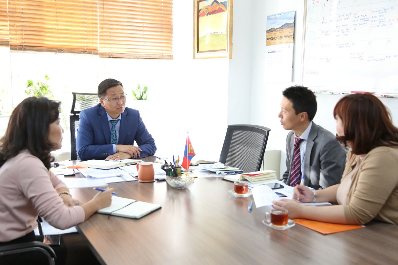 Хүнс, хөдөө аж ахуй, хөнгөн үйлдвэрийн яамны Жижиг, дунд үйлдвэр, хоршооны бодлогын хэрэгжилтийг зохицуулах газрын дарга Я.Эрдэнэсайхан, мэргэжилтэн Б.Мөнхцэцэг нар Японы Улсын Олон Улсын Хамтын ажиллагааны байгууллага ЖАЙКА-гийн Монгол дахь Төлөөлөгчийн газрын суурин төлөөлөгч Изүми Кейта, Хөтөлбөрийн ажилтан Т.Оюунчулуун нартай уулзав.