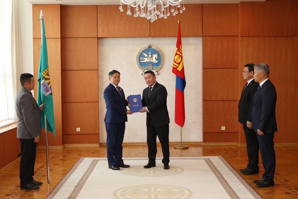 Зарлигийг уншиж сонордуулсны дараа Монгол Улсын Ерөнхийлөгч Х.Баттулга Алтан гадас одонг тус байгууллагын туганд зүүн өгч, баяр хүргэв.