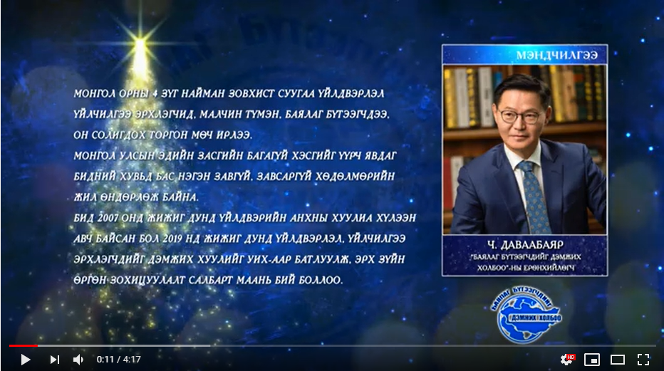 БАЯЛАГ БҮТЭЭГЧДИЙГ ДЭМЖИХ ХОЛБООНЫ ЕРӨНХИЙЛӨГЧ Ч.ДАВААБАЯРЫН ШИНЭ ЖИЛИЙН МЭНДЧИЛГЭЭ.