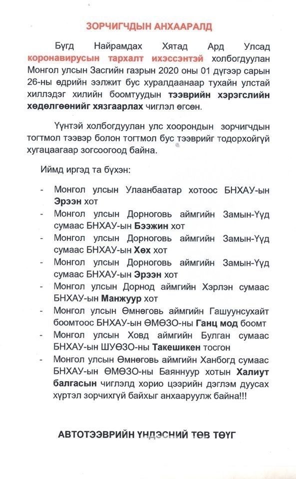 - Монгол Улсын Өмнөговь аймгийн Ханбогд сумаас БНХАУ-ын ӨМӨЗО-ны Баяннуур хотын Халиут балгасын чиглэлд хорио цээрийн дэглэм дуусах хүртэл зорчихгүй байхыг анхааруулж байна.