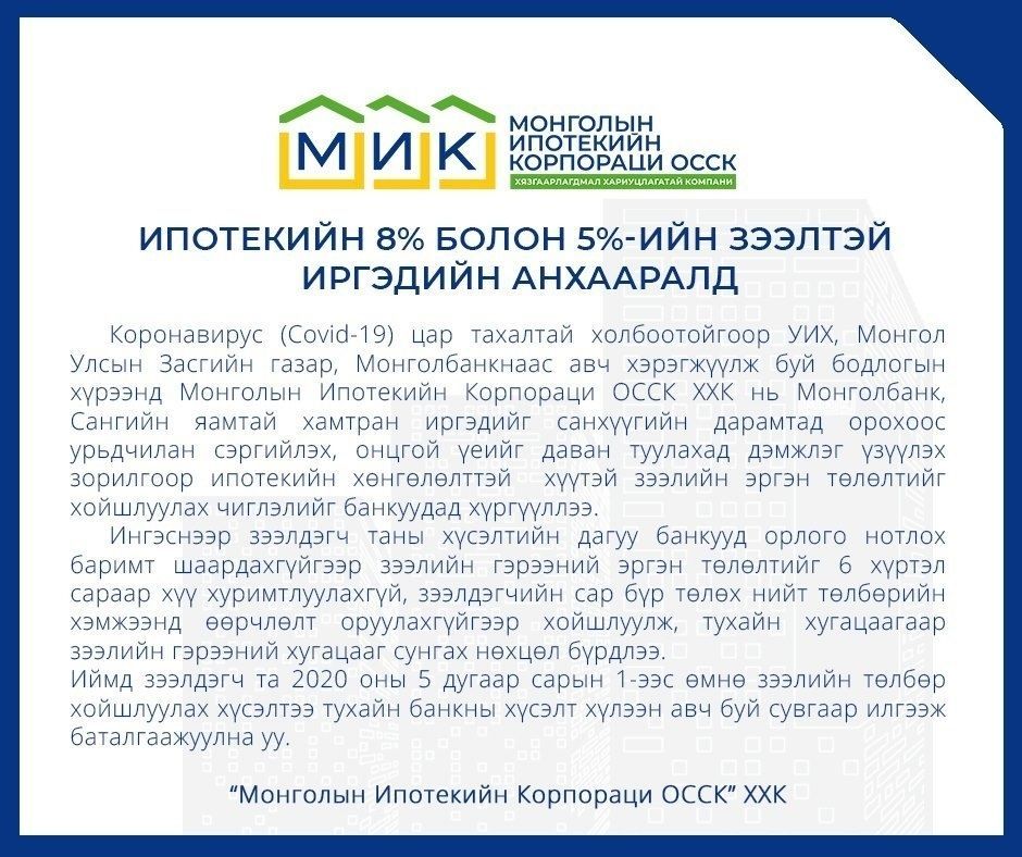 Коронавирус (Covid-19) цар тахалтай холбоотойгоор УИХ, Монгол Улсын Засгийн газар, Монголбанкнаас авч хэрэгжүүлж буй бодлогын хүрээнд Монголын Ипотекийн Корпораци ОССК ХХК нь Монголбанк, Сангийн яамтай хамтран иргэдийг санхүүгийн дарамтад орохоос урьдчилан сэргийлэх, онцгой үеийг даван туулахад дэмжлэг үзүүлэх зорилгоор ипотекийн хөнгөлөлттэй