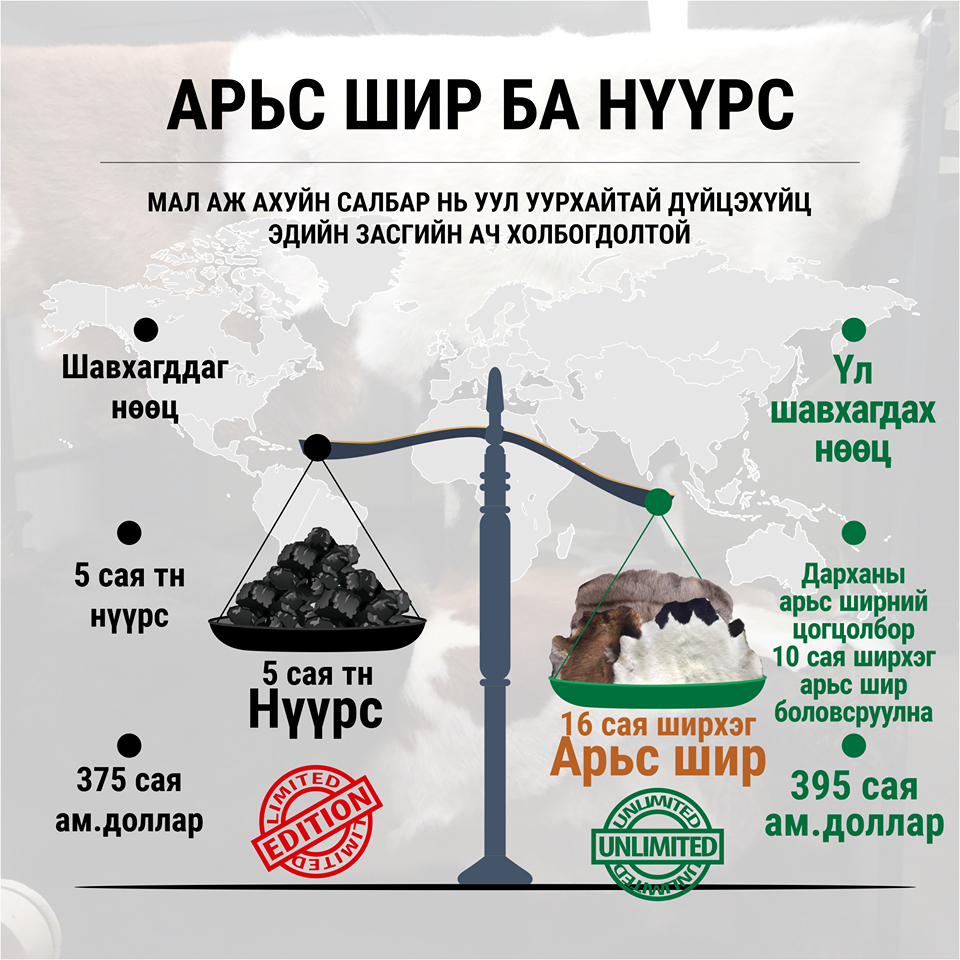 Монгол 70 САЯ ГАРУЙ МАЛТАЙ хэр нь нэг арьсыг бүрэн боловсруулахад 25 цент ч хүрэхгүй орлого буюу жилд 46 ТЭРБУМ ТӨГРӨГИЙН ОРЛОГО олдог нь мал аж ахуйн орон манай улсын хувь дэндүү хангалтгүй үзүүлэлт.