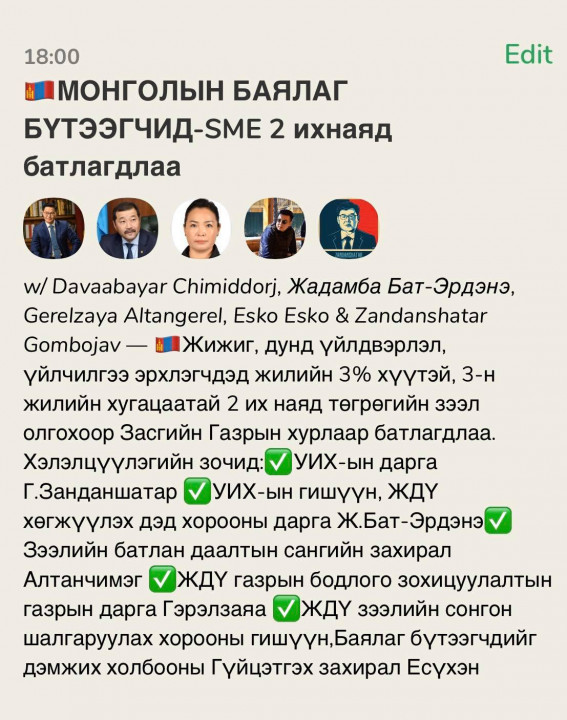 “Баялаг бүтээгчдийг дэмжих холбоо”-ноос Засгийн газраас олгох 2 их наядын зээл санхүүжилтыг Жижиг, дунд үйлдвэрлэлд олгоно гэж байгаатай холбогдуулаад өнөөдөр 3 дахь удаагийн хэлэлцүүлгээ зохион байгуулж байна. Өмнөх 2 удаагийн хэлэлцүүлгээр нийт 10000 гаруй хүмүүс оролцож санал бодлоо хэлсэн. Энэ санал бодлууд бүгд манай холбоон дээр нэгтгэгдэж байгаа. Өнөөдрийн хэлэлцүүлгээ оруулаад нэгтгээд Их хурал, Засгийн газарт хүргүүлнэ.