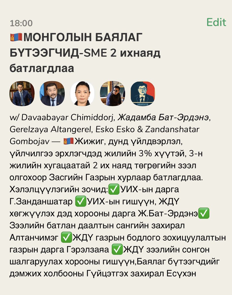 “Баялаг бүтээгчдийг дэмжих холбоо”-ноос Засгийн газраас олгох 2 их наядын зээл санхүүжилтыг Жижиг, дунд үйлдвэрлэлд олгоно гэж байгаатай холбогдуулаад CLUBHOUSE дээр цуврал хэлэлцүүлгүүд зохион байгуулсан бөгөөд хэлэлцүүлгээр нийт давхардсан тоогоор 25000 гаруй хүмүүс оролцож санал бодлоо хэлсэн.