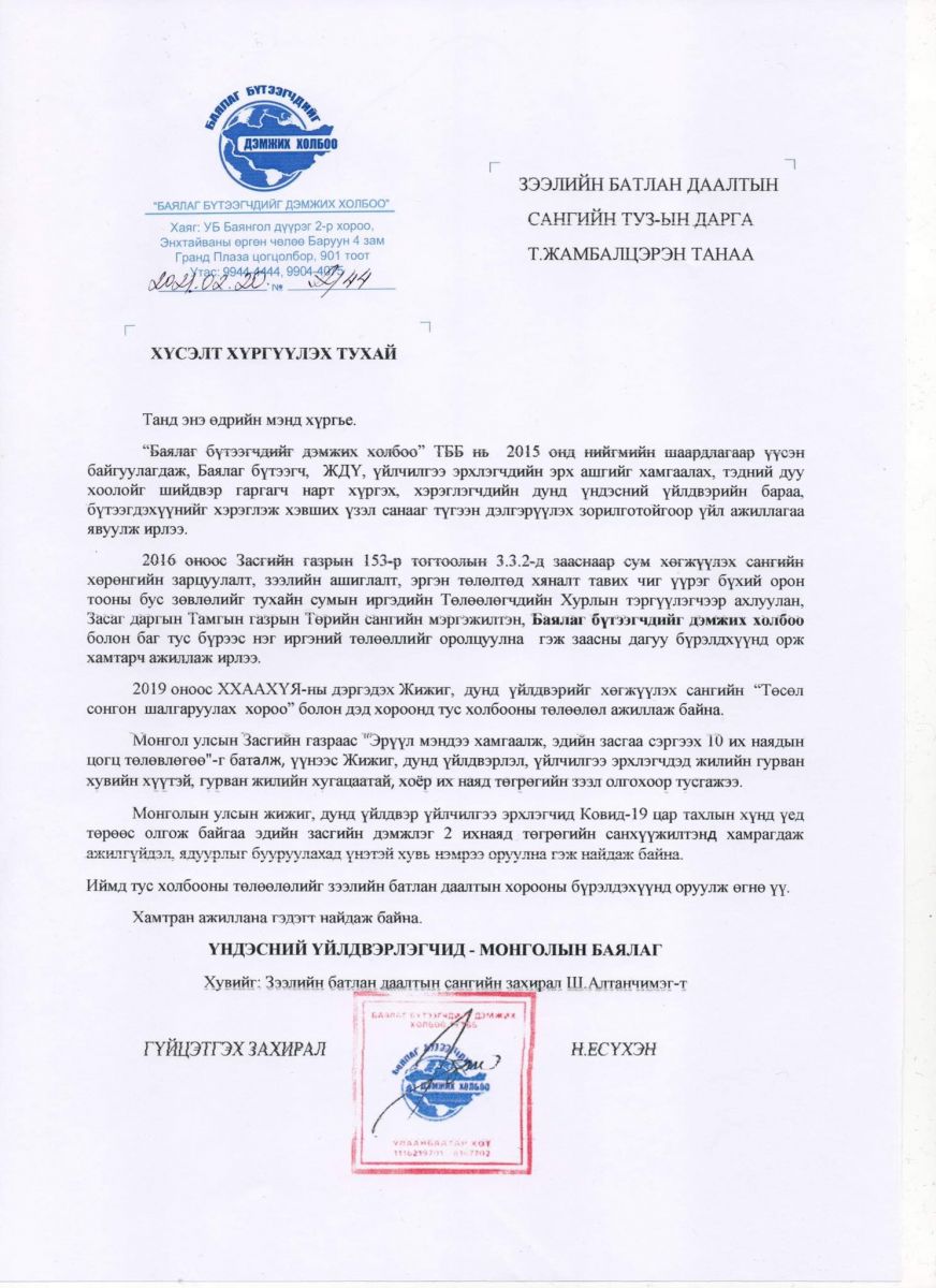 “ЖДҮ- 2 ИХ НАЯД: "БАЯЛАГ БҮТЭЭГЧДИЙГ ДЭМЖИХ ХОЛБОО" ЗЭЭЛИЙН БАТЛАН ДААЛТЫН САНД АЛБАН ХҮСЭЛТ ХҮРГҮҮЛЛЭЭ.