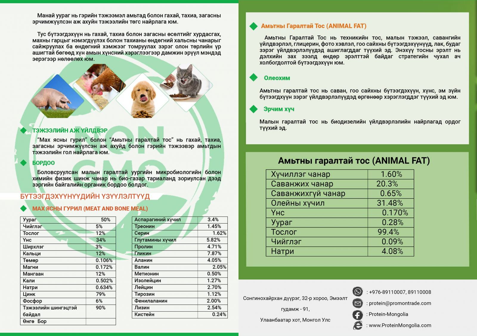 Протейн үйлдвэр нь малын хаягдал түүхий эдийг өндөр чанарт боловсруулсан "Бона" бордоо, мах ясны гурил, амвтны гаралтай тос үйлдвэрлэж байна.