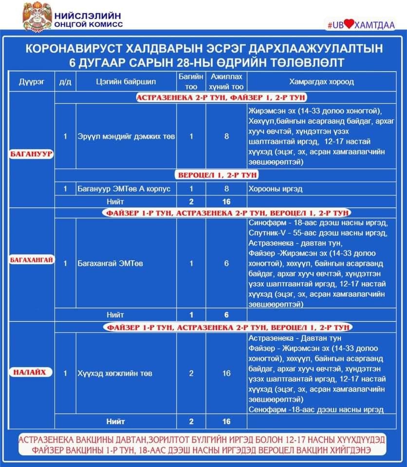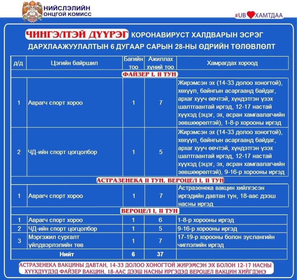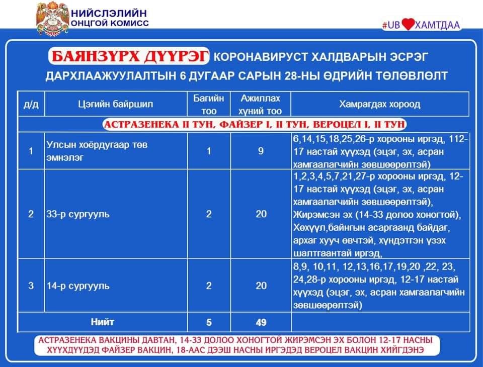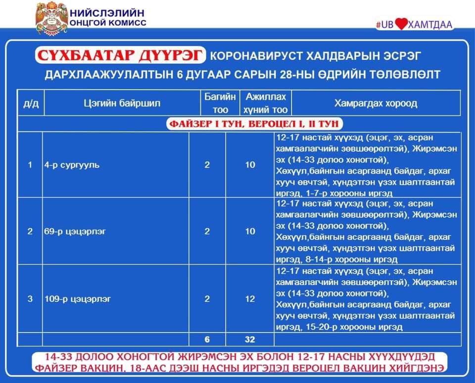 Улаанбаатар хотод 23 суурин цэгт, 36 багийн 262 эмч, ажилчид 12594 иргэнийг дархлаажуулна. Мөн өнөөдрөөс /06.28/ эхлэн 12-15 насны хүүхдүүдийг сайн дурын үндсэн дээр Pfizer вакцинаар дархлаажуулалтад хамруулна. Дархлаажуулалтад хамрагдах хүүхдүүдэд Pfizer үйлдвэрийн вакцин хийх юм. Хүүхдээ дархлаажуулалтад хамруулахыг хүссэн эцэг эх, асран хамгаалагч нь харьяа дүүргийнхээ Pfizer вакцин хийж буй дархлаажуулалтын цэгт хамт очиж зөвшөөрлийг хуудас бөглөх учиртай.