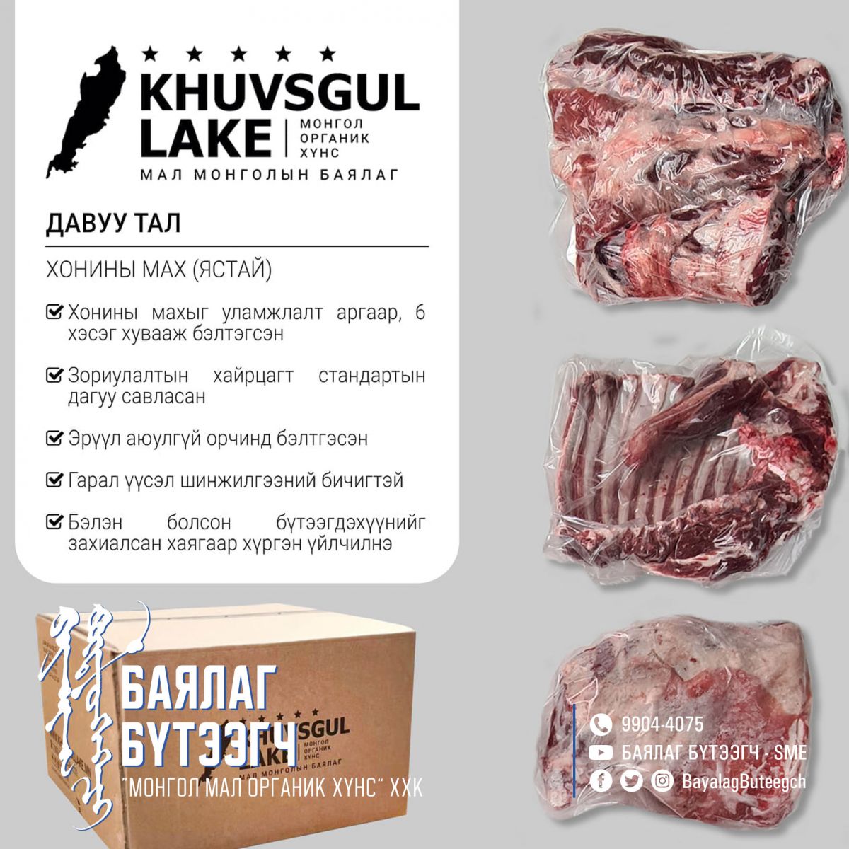Мал, махны төрөлжсөн цахим дэлгүүр нь Хөвсгөл аймгийн малчдаас малаа авч, Хөвсгөл аймгийн махны үйлдвэрт бэлтгэн шууд таны гарт хүргэдэг бөгөөд хэрэглэгч та бүхэнд дараах үйлчилгээг үзүүлдэг.