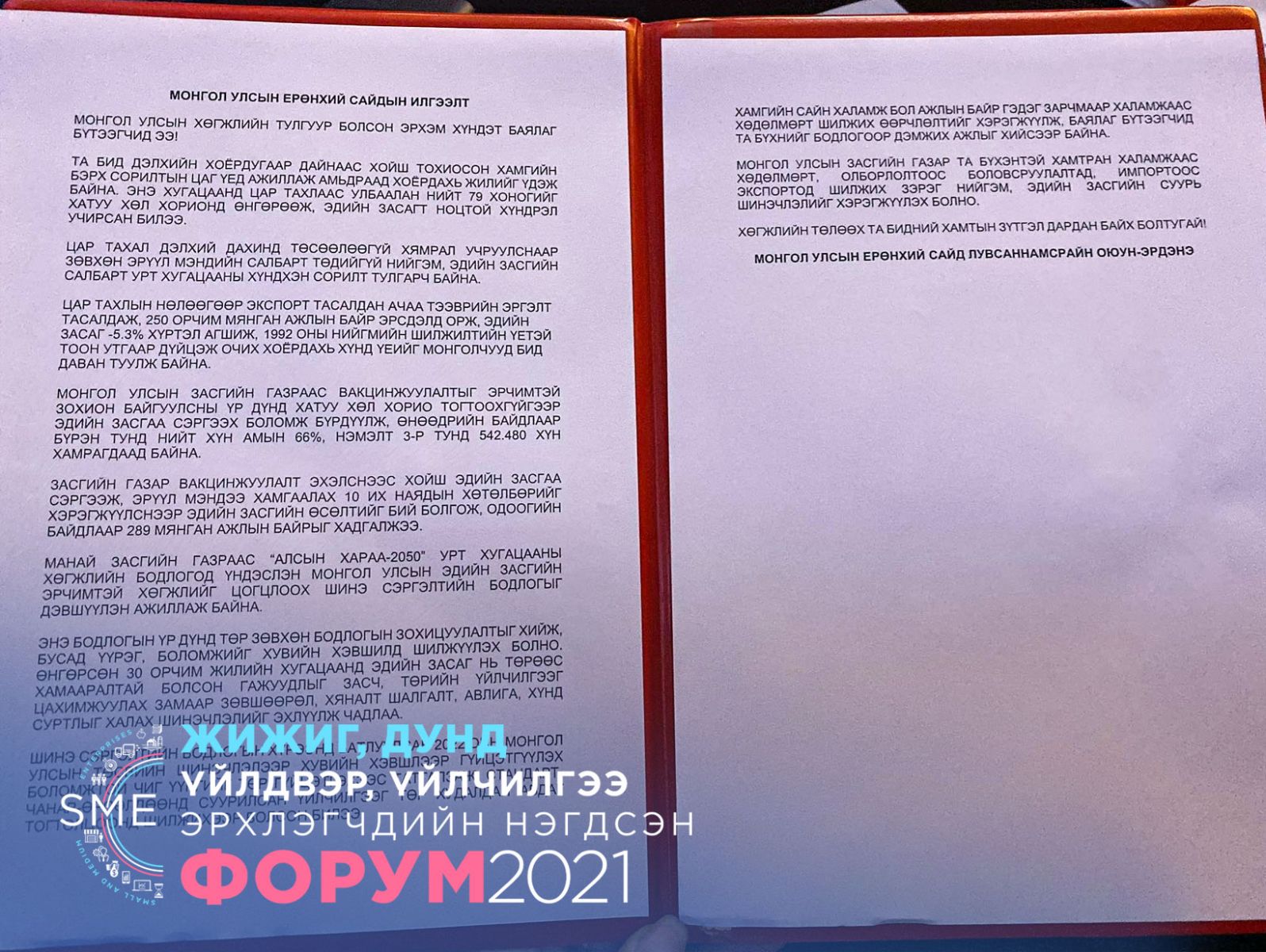 Монгол Улсын Ерөнхий Сайд Л.Оюун-эрдэнэ Жижиг, дунд үйлдвэрлэл, үйлчилгээ эрхлэгчдийн форумд илгээлт хүргүүлсэн юм. Тус илгээлтээрээ дамжуулан хамгийн сайн халамж бол ажлын байр гэдэг зарчмаар