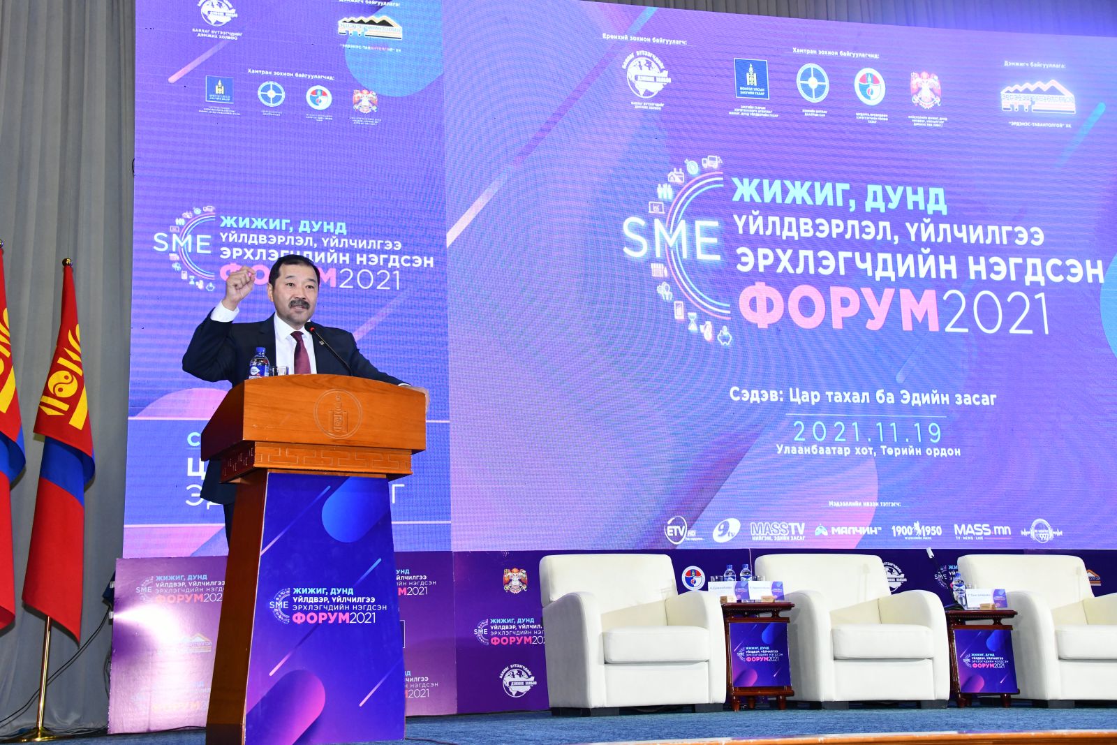 Өнөөдөр бидний хувьд маш чухал форум зохиогдож байна. Монгол Улсын үйлдвэр, үйлчилгээний 80-90 хувийг ЖДҮҮ-нийхэн үүрч байна гэх судалгаа байдаг. Тийм учраас энэ улсын нийт үйлдвэр, үйлчилгээний гол төлөөлөгчид энд хуран цугласан байна. Бид энэ форумыг гурав дахь удаагаа зохион байгуулж байна. Өнгөрсөн 2 жилийн хугацаанд цар тахлаас болж багагүй хүнд үеийг тууллаа. Засгийн газраас шинэ сэргэлтийн бодлогыг гаргаад явж байна. Тэгэхээр үйлдвэрлэл, ажлын байраа сэргээх боломж байна гэсэн үг. Өнөөдрийн үйл ажиллагаанд та бүхнээс санал, шийдэл гарна гэж бодож байна. Эрүүл мэнд, эдийн засаг сэргээх 10 их наядын хөтөлбөрөөс 4 орчим их наяд нь зарцуулагдчихсан байгаа. Цаана нь үлдсэн боломжоос бид яаж хүртэх вэ? гэдэг чухал асуудал. Ядаж 100 тэрбум төгрөг ЖДҮҮ дээр тавиад өгөөч гээд төсвийн байнгын хороон дээр зогсож байх үеийг бодвол 10 их наяд гэдэг асар их тоо юм. Энэ тогооноос ЖДҮҮ-тэй ямар байдлаар уялдуулж авах вэ гэдэг асуудлыг өнөөдөр тодорхойлно гэж найдаж байна. Та бүхэн энэ асуудлаар холбогдох байгууллагынхаа удирдах албан тушаалтнуудын “чихийг мушгиж” байх ёстой.