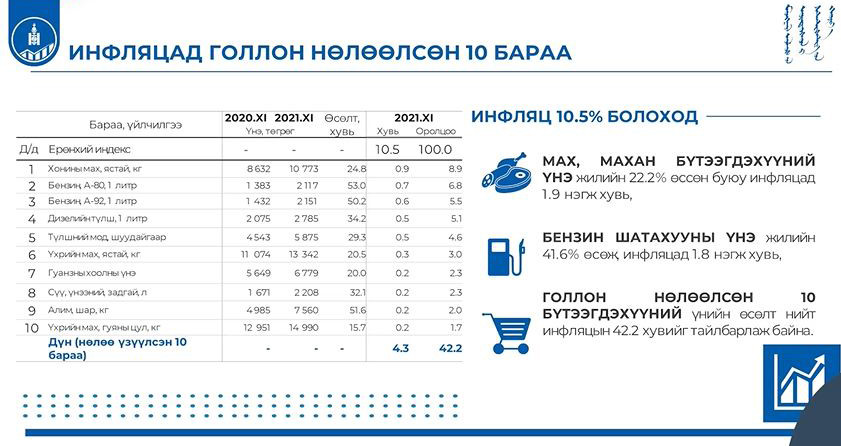 2021 оны 11-р сард инфляц 10,5 хувь гарсны 5 нэгж буюу 47,6 хувиар хүнсний бүтээгдэхүүний үнэ нөлөөлж байна. Мөн инфляцад импортын барааны үнэ 50,4 хувиар нөлөөлж байна гэв.