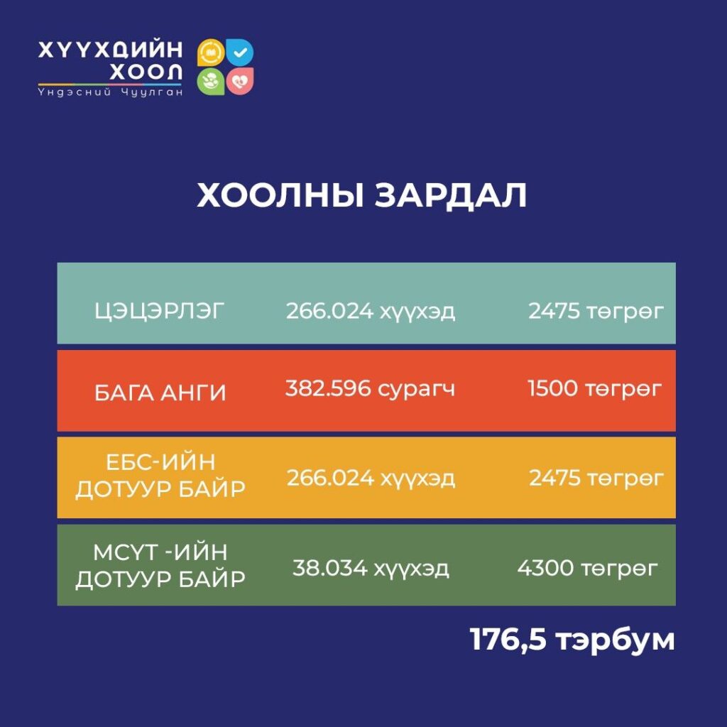 Гэвч эдийн засгийн байдал, цар тахлын нөлөөний улмаас хүнсний бараа үйлчилгээний үнийн өсөлтөөс шалтгаалж хүүхдүүд дээрх хэмжээний дөнгөж 50 хувийг л авч байна. Иймд уг асуудлаар холбогдох хууль тогтоомжид нэмэлт, өөрчлөлт оруулах, стандартын шаардлага хангасан сургууль, цэцэрлэгийн гал тогооны орчныг бүрдүүлэх, инфляцийн түвшинтэй уялдуулж, хоолны зардлыг нэмэгдүүлэх замаар хүүхдийн хоолны чанар хүртээмжийг сайжруулах шаардлагатай байгааг онцоллоо.