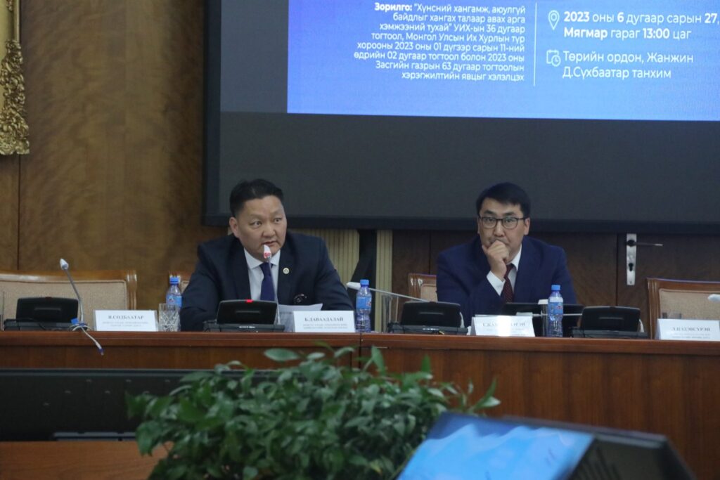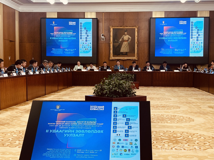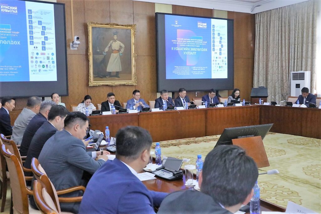 "Хүнсний хангамж, аюулгүй байдлыг хангах талаар авах зарим арга хэмжээний тухай" УИХ-ын 36 дугаар тогтоолыг хэрэгжүүлэгч төрийн байгууллагуудын 2 дахь удаагийн зөвлөлдөх уулзалт өнөөдөр /2023.06.27/ Төрийн ордны Сүхбаатар танхимд зохион байгуулагдлаа.