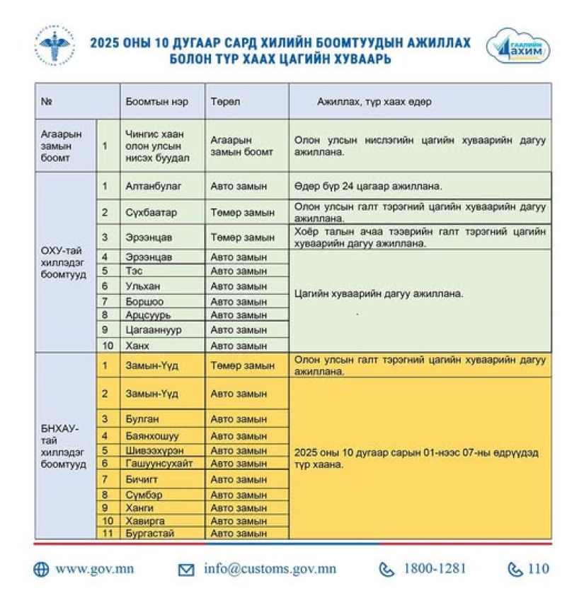 Монгол Улсын БНХАУ-тай хиллэдэг авто замын боомтуудыг 10 дугаар сарын 1-7-нд түр хаана. Учир нь дээрх өдрүүдэд БНХАУ-ын үндэсний баярын өдрүүд тохиож байгаа юм. Тус улсын Засгийн газраас