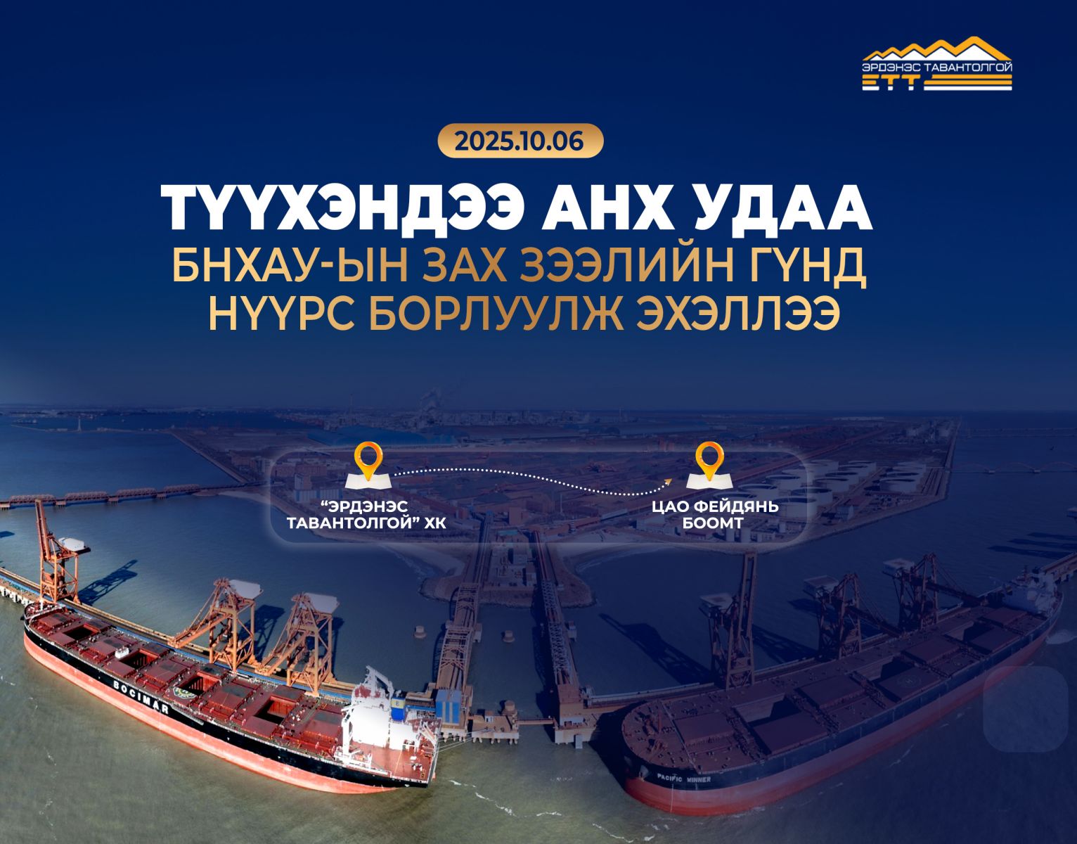 "Эрдэнэс Тавантолгой" ХК 2025 оны 10 дугаар сарын 6-ны өдөр Монголын Хөрөнгийн Биржээр дамжуулан 6,4 мянган тонн баяжуулсан коксжих нүүрсийг АНХ УДАА БНХАУ-ын Цао Фейдянь боомт хүргэж өгөх нөхцөлөөр амжилттай арилжааллаа.