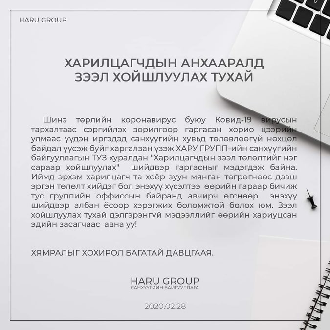 ХАРУ групп үүнийг харгалзан үзэж, харилцагчдынхаа зээлийн эргэн төлөлтийг нэг сараар хойшлуулжээ. Тус группын дийлэнх харилцагчид автомашины лизинг буюу 10 саяас дээш төгрөгийн зээлтэй байдаг гэнэ.