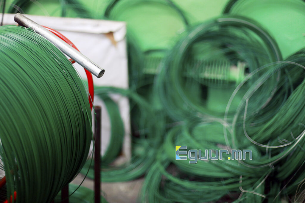 Үйлдвэрийн хамгийн эхний төхөөрөмж бол резинэн бүрээстэй бүтээгдэхүүн гаргах машин байв. Эхлээд түүхий эд болох төмөр утсыг автомат машины тусламжтайгаар зүлэг ногоон өнгөөр будна. Үүрмэг хэлбэртэй хатуу будгийг машинд хийж дүүргэсний дараагаар халаагуураар хайлуулж, төхөөрөмж автоматаар будгаа түлхэж, төмөр утсаа будна. Өндөр хэмд будагдсан халуун төмөр утсыг тасалгааны хэмтэй усаар хөргөж бэлэн болгоно. Төмөр утасны бэлдэцийг шууд энэ чигээр нь худалдан авдаг бөгөөд Монгол Улсад нарийн төмөр утас үйлдвэрлэдэггүй тул ийн худалдан авахаас өөр аргагүй.