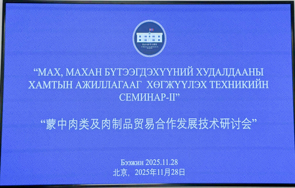 БНХАУ-ын Бээжин хотноо “Монгол, Хятадын мах, махан бүтээгдэхүүний худалдааг хөгжүүлэх техникийн II семинар” 2025 оны 11 дүгээр сарын 28-нд болж, хоёр улсын төрийн байгууллага, мэргэжлийн холбоод, хувийн хэвшлийн төлөөллүүд худалдаа, хүнсний аюулгүй байдал, экспортын зохицуулалтын талаар өргөн хүрээтэй хэлэлцлээ.