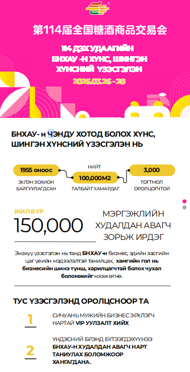 China Food and Drinks Fair (CFDF) нь 1955 онд анх зохион байгуулагдсан бөгөөд БНХАУ-ын хүнс, ундааны салбарын хамгийн урт түүхтэй, томоохон мэргэжлийн үзэсгэлэнгийн нэг юм. Тус арга хэмжээг China Sugar and Wine Group Corporation жил бүр хавар, намрын улиралд хоёр удаа зохион байгуулдаг.
