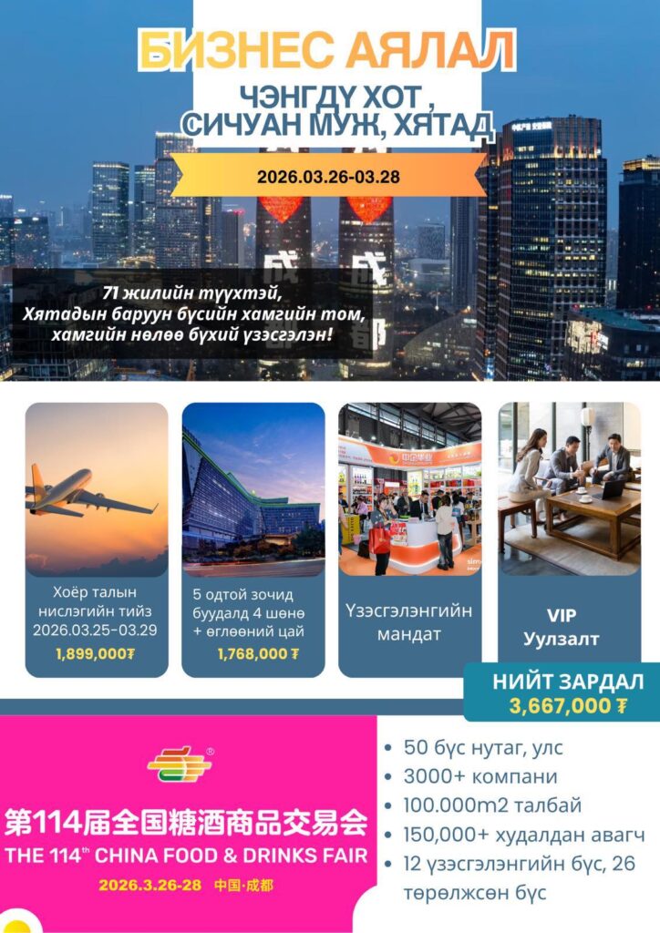 ЖДҮҮХолбооны дэд ерөнхийлөгч болон Удирдах зөвлөлийн гишүүдийн төлөөлөл БНХАУ-ын Сичуан мужийн Чэнгдү хотод шингэн хүнс, сав баглаа боодлын үзэсгэлэнд оролцохоор хүлгийн жолоо заллаа